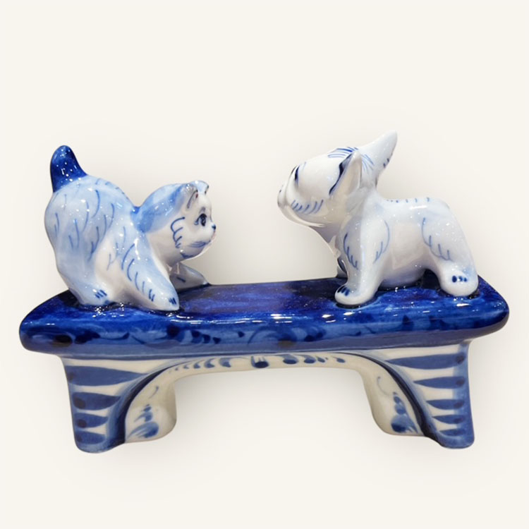 犬と猫の性格をとってもよく表しているようなポーズのクスッと笑える置き物。