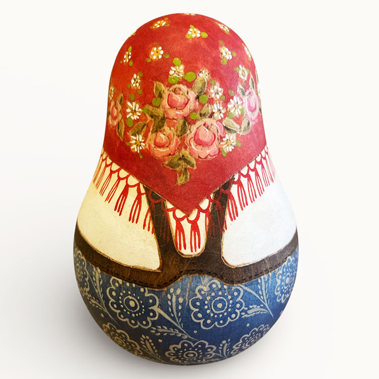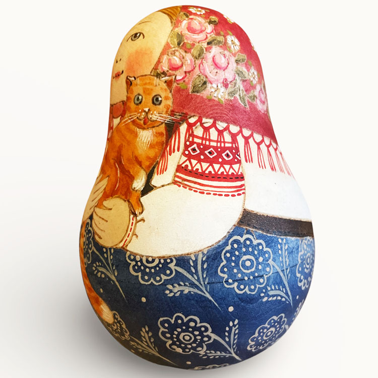 まん丸お目めで何かに驚いているような猫を抱いた起き上がり小法師。