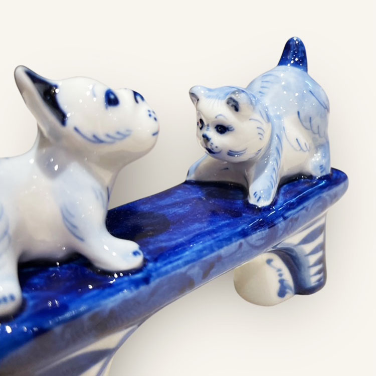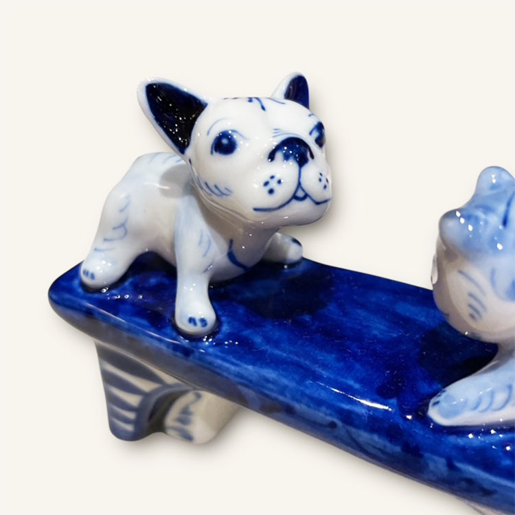 犬と猫の性格をとってもよく表しているようなポーズのクスッと笑える置き物。
