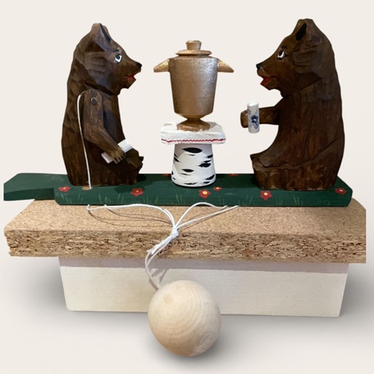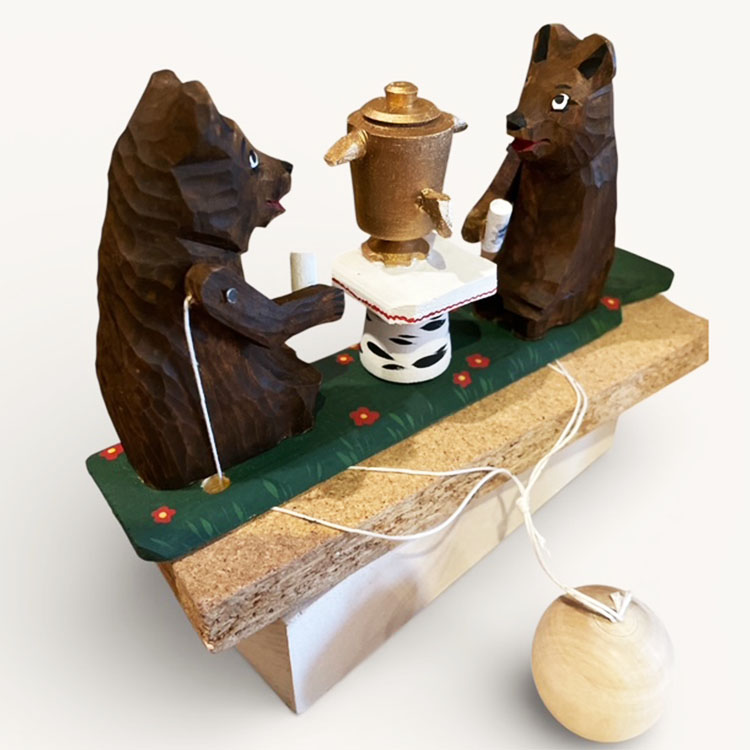 ボゴロツカヤに伝わる木彫りの伝統玩具で、吊るしてある丸い錘を回すことで熊たちがお茶を飲む動きをします。
